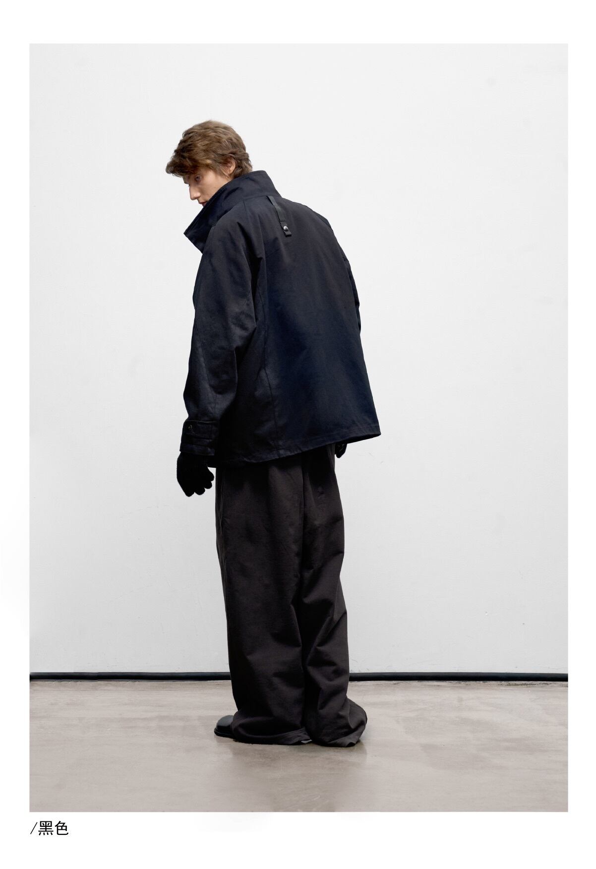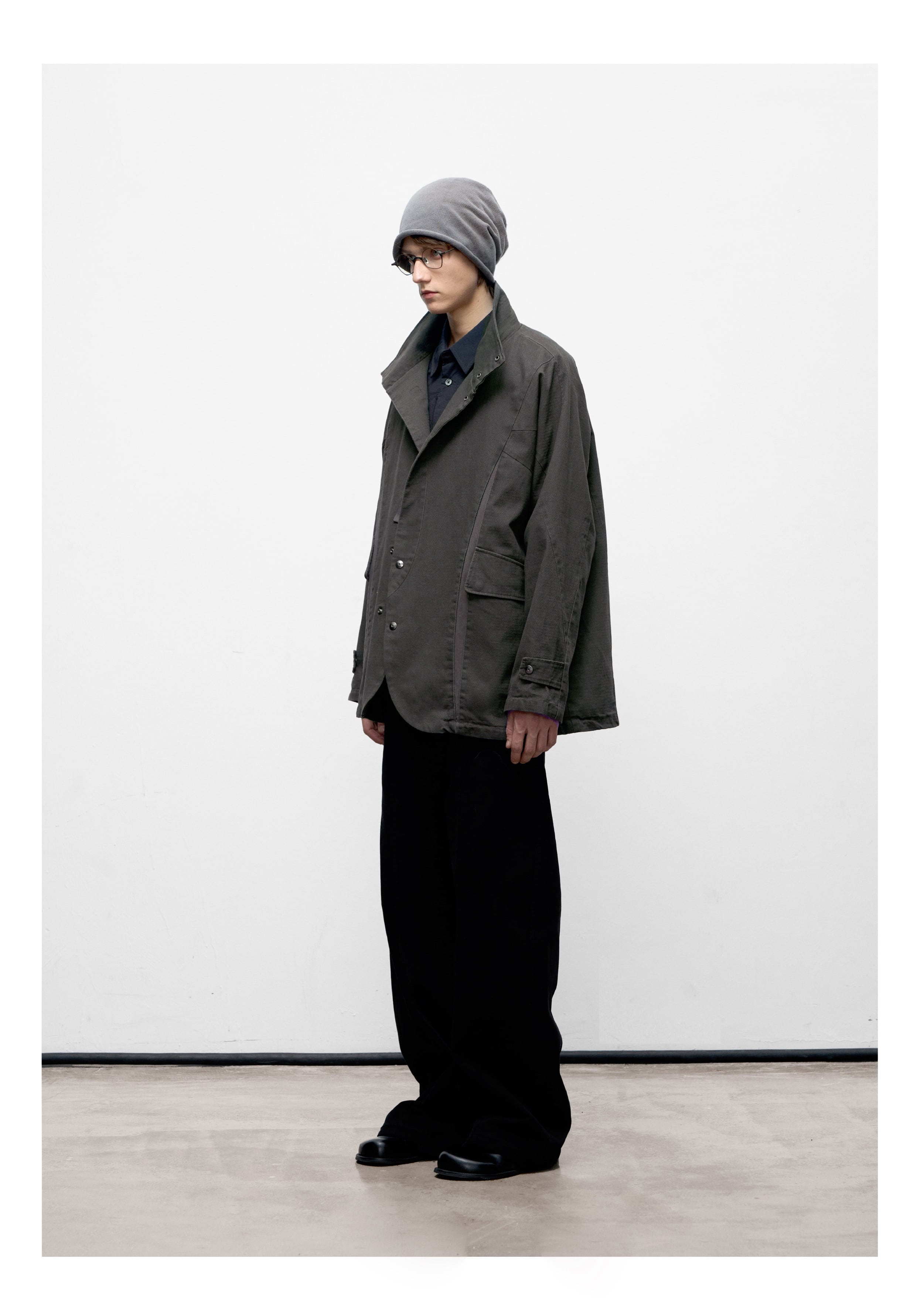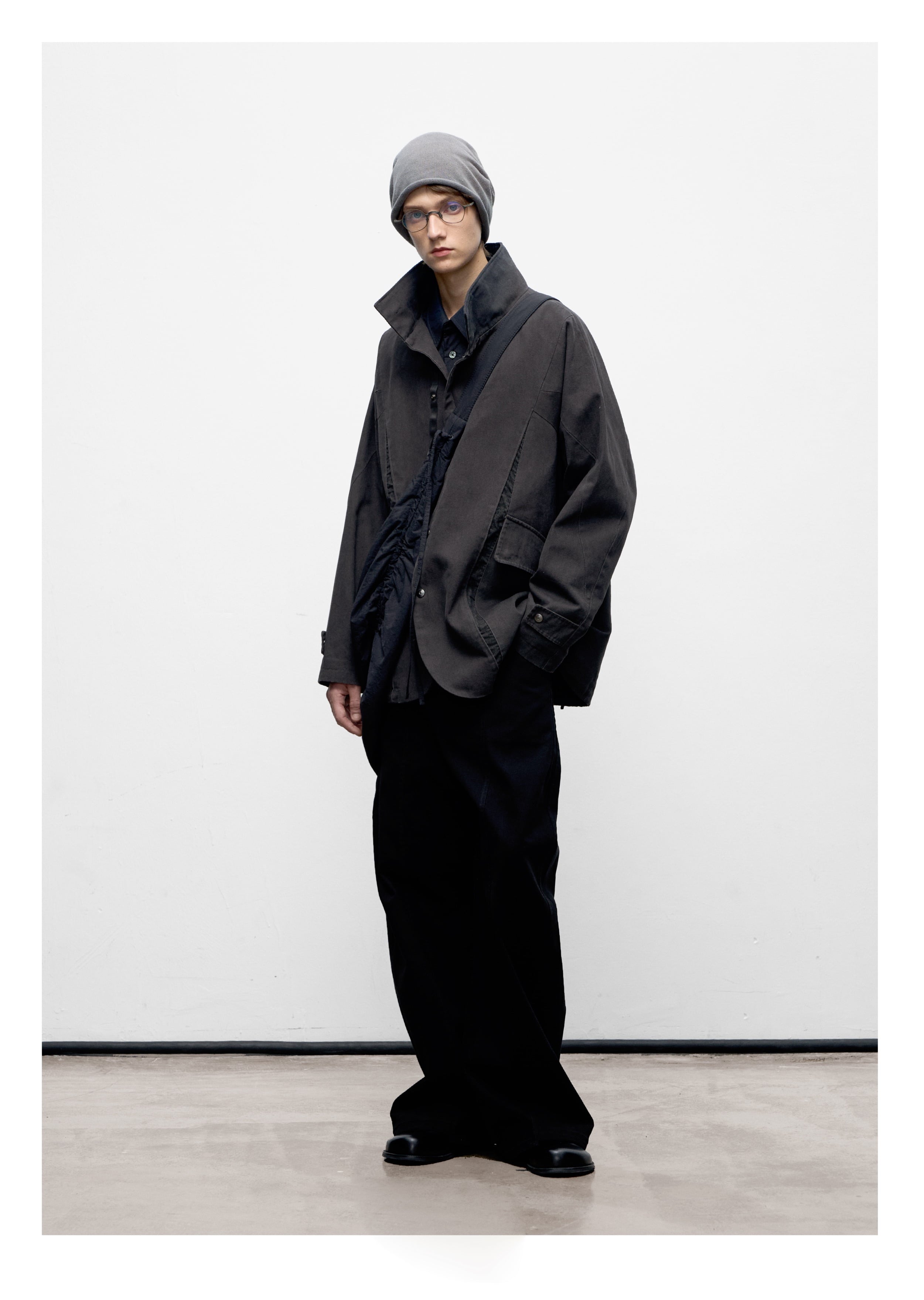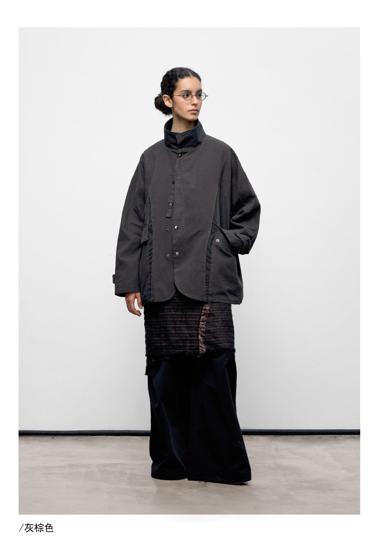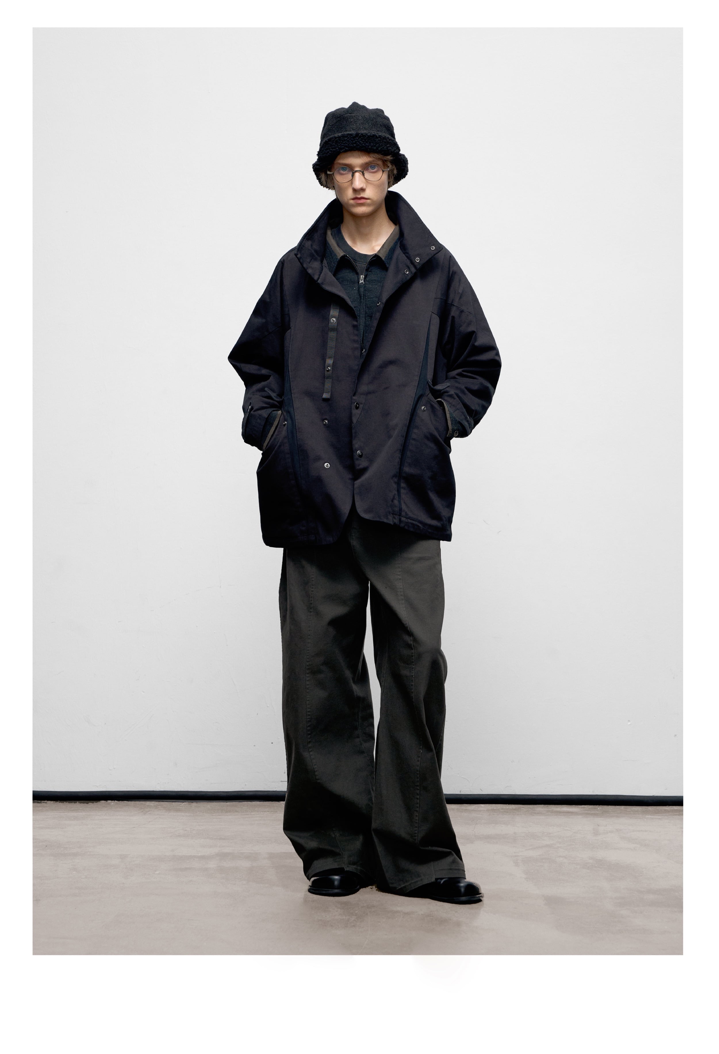 カーブした前立てと一体型袖のデザインがシルエットにボリューム感を加えゆるやかなシルエットを演出