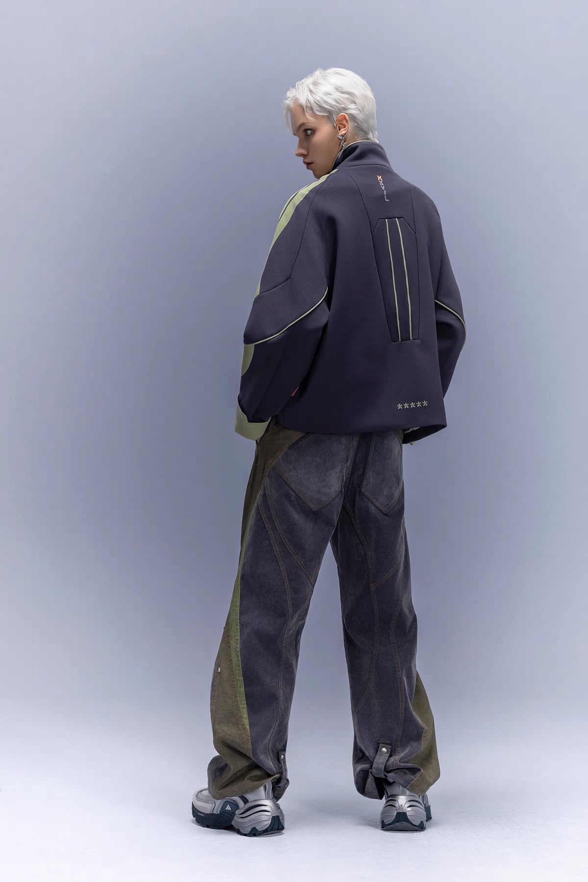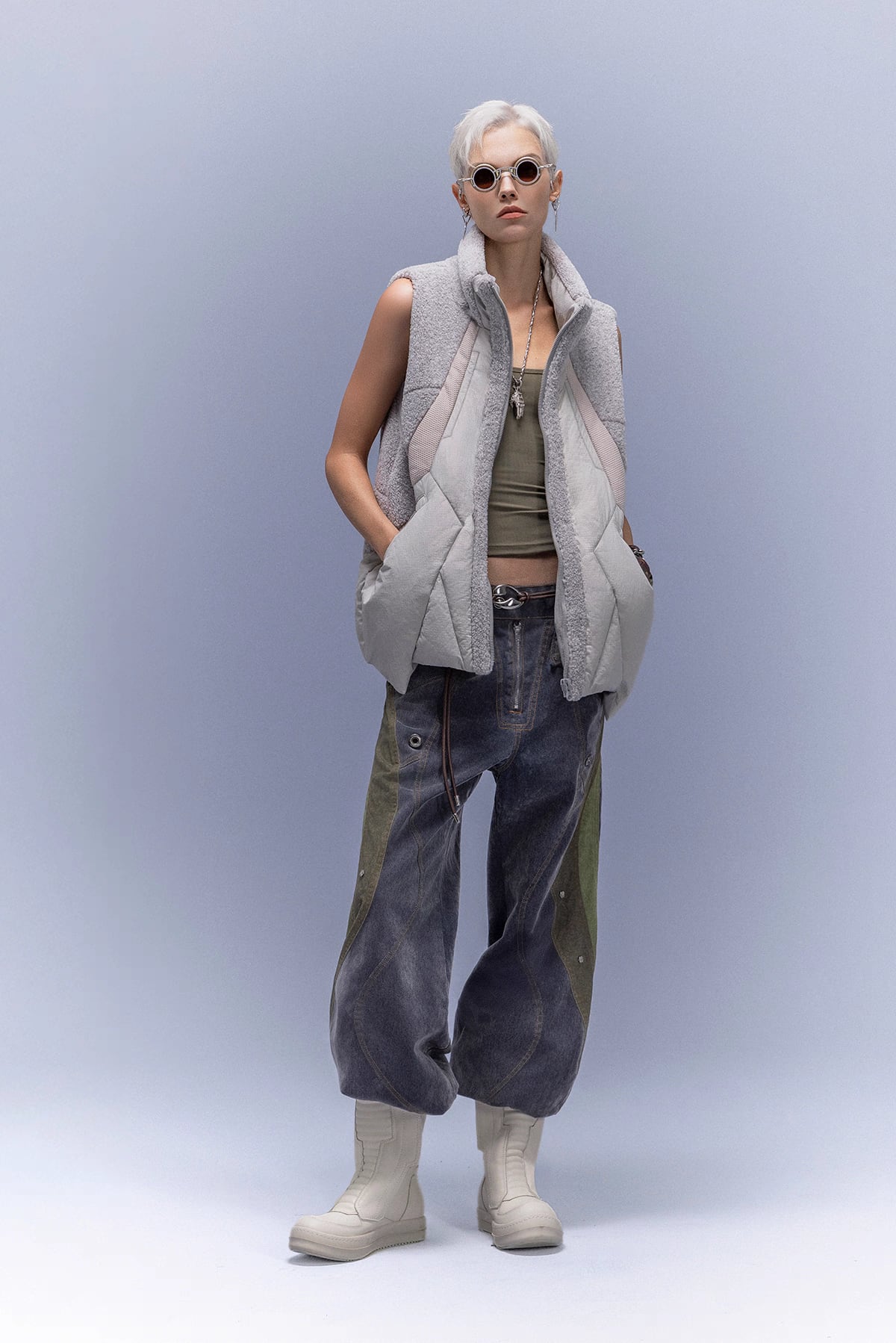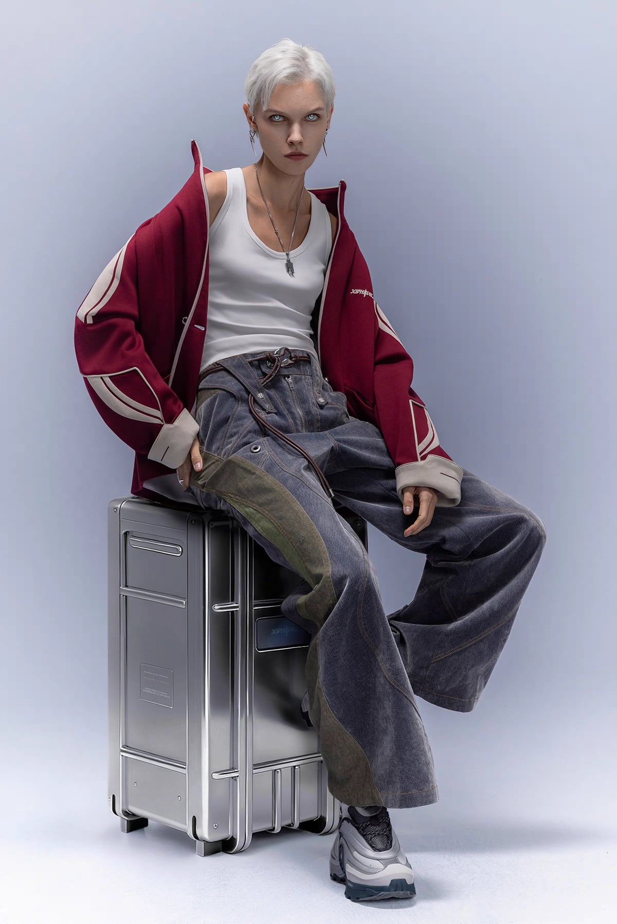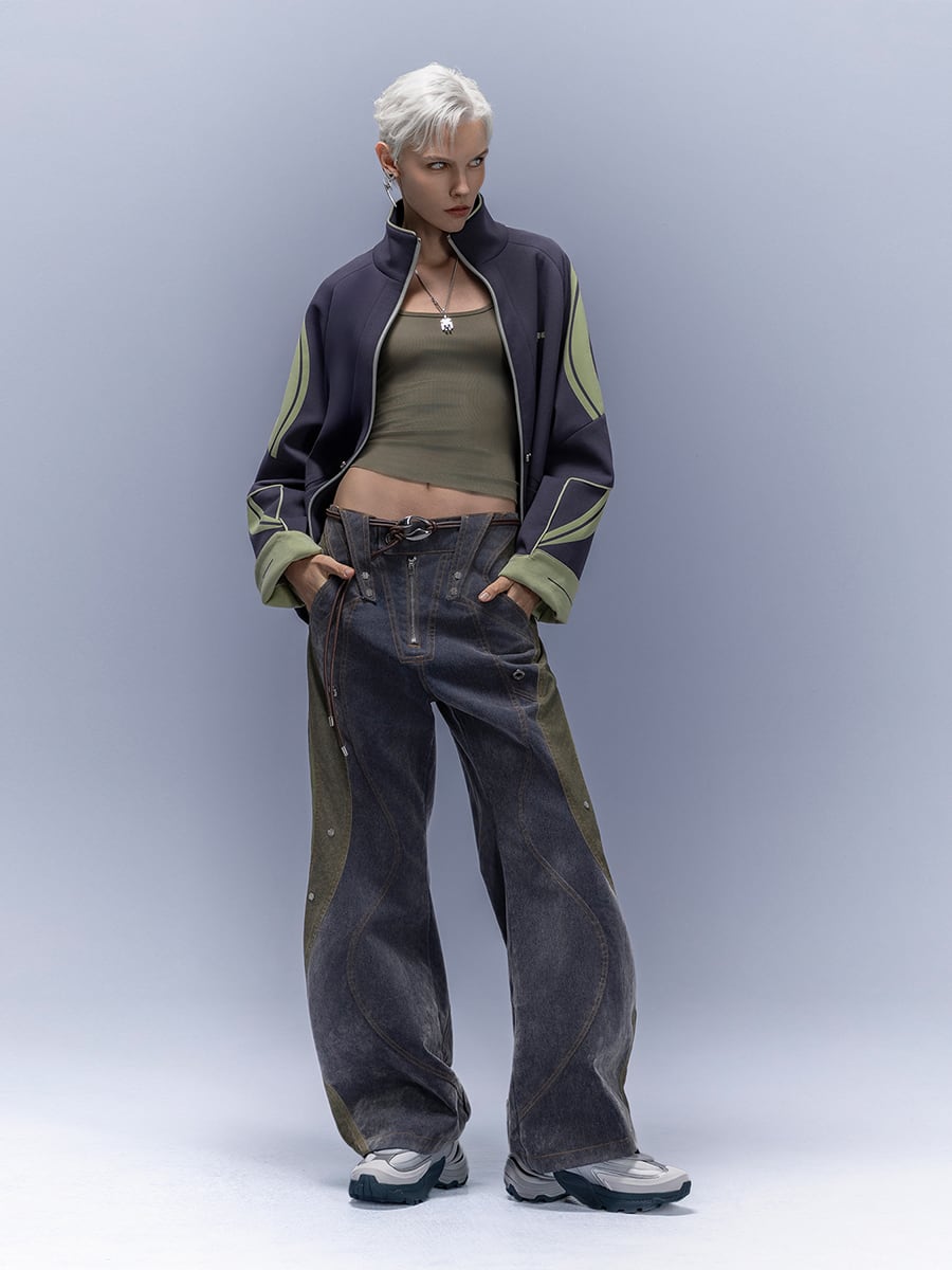 シルキーな光沢を帯びたデニム生地に、滑らかなラインを描くカーブドパンツシルエット。