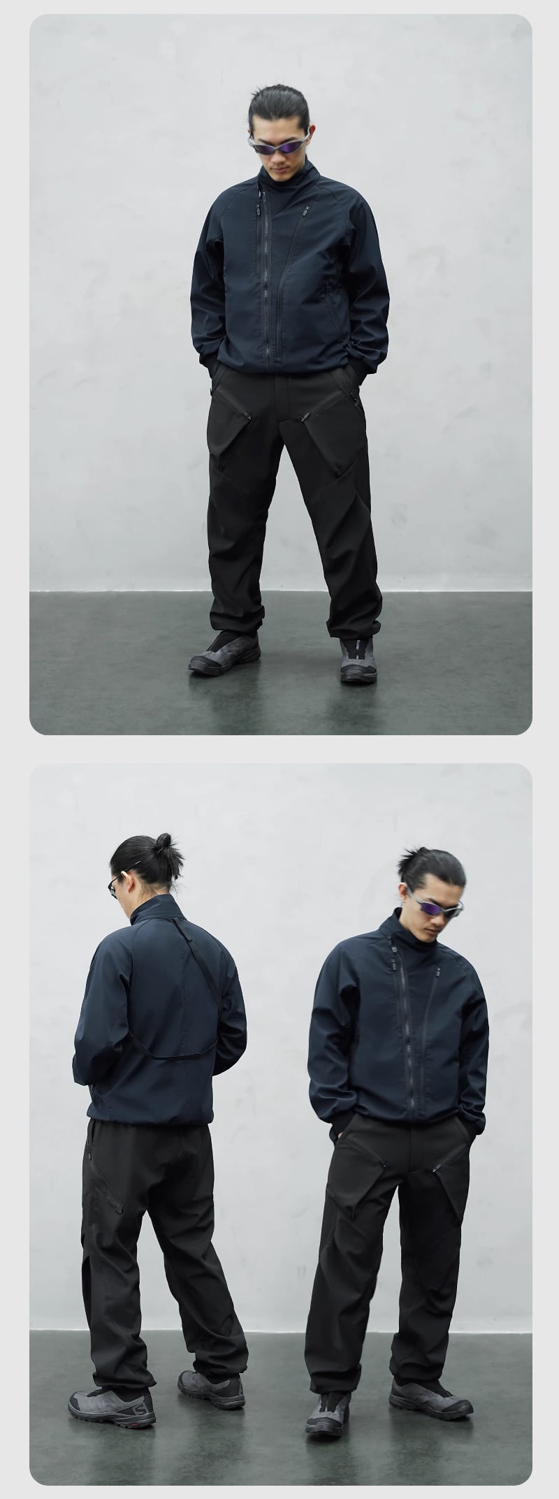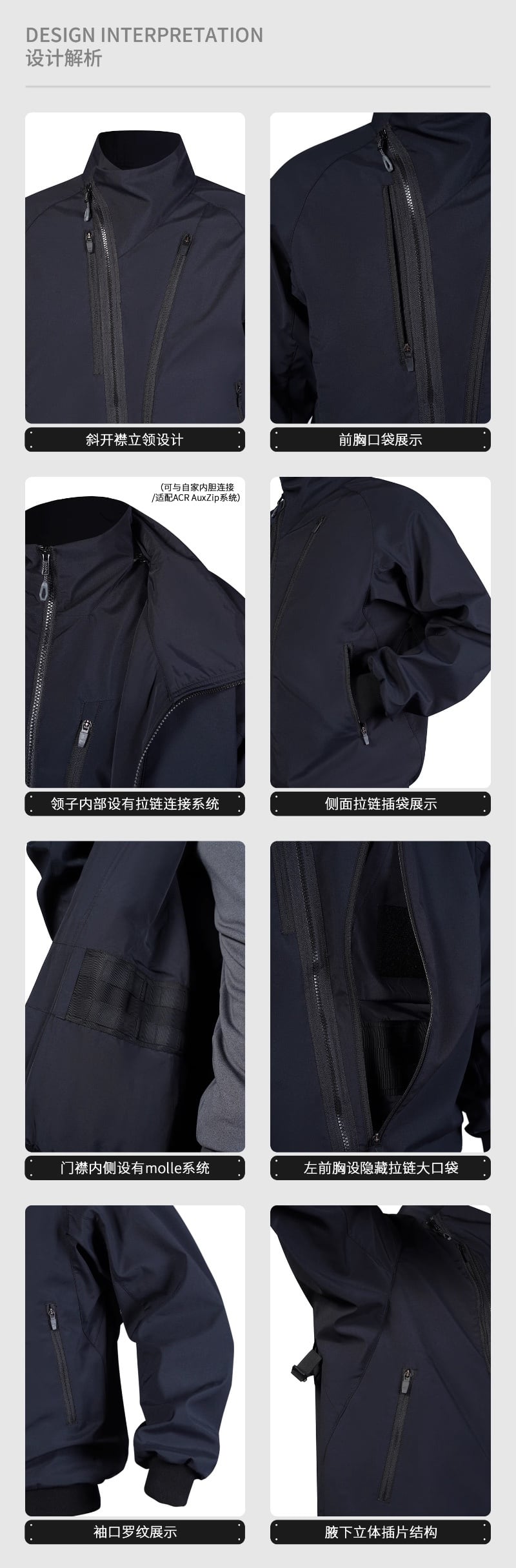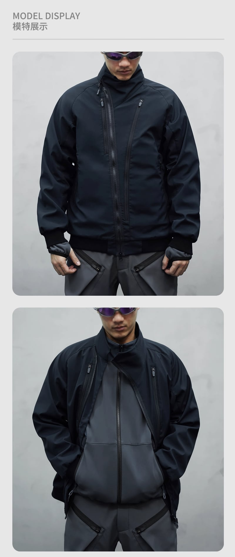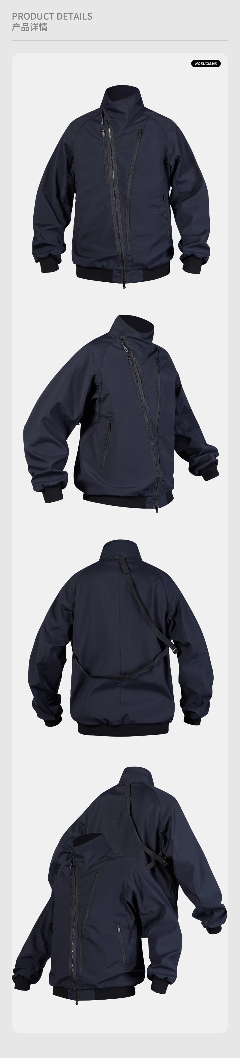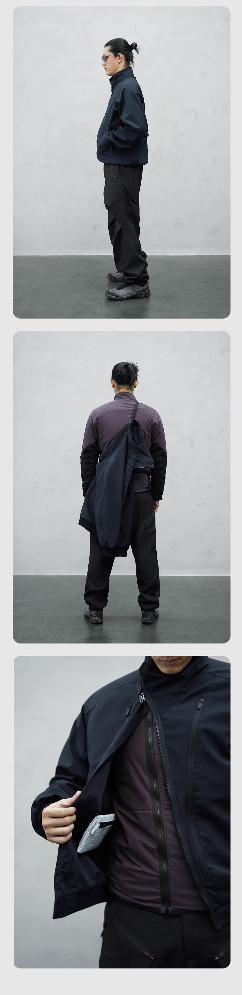 スタンドカラー:斜め開襟でシャープ、控えめなミリタリーモダンの表情。