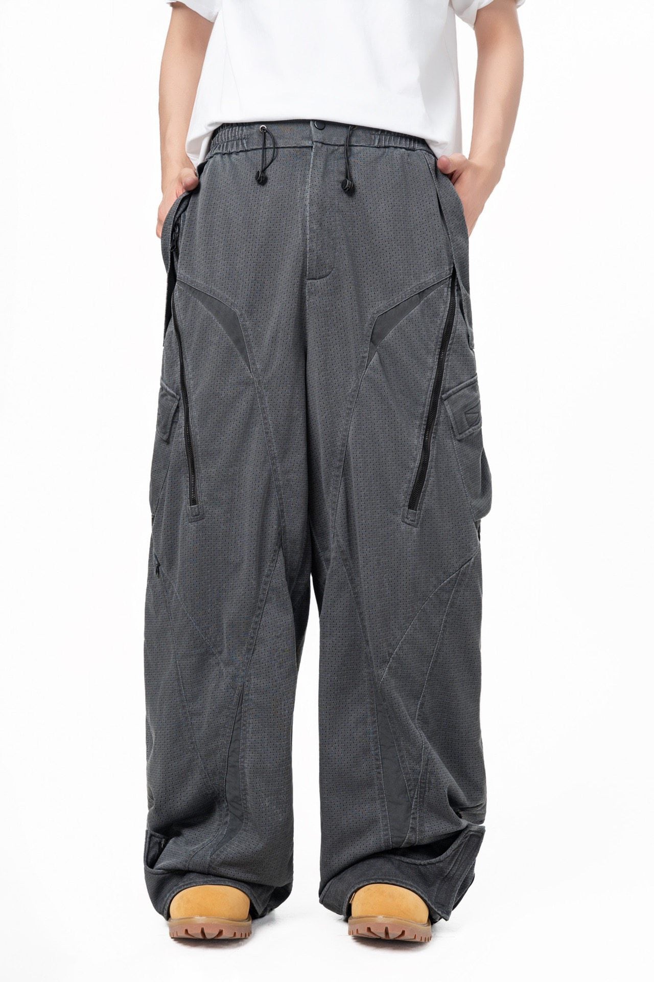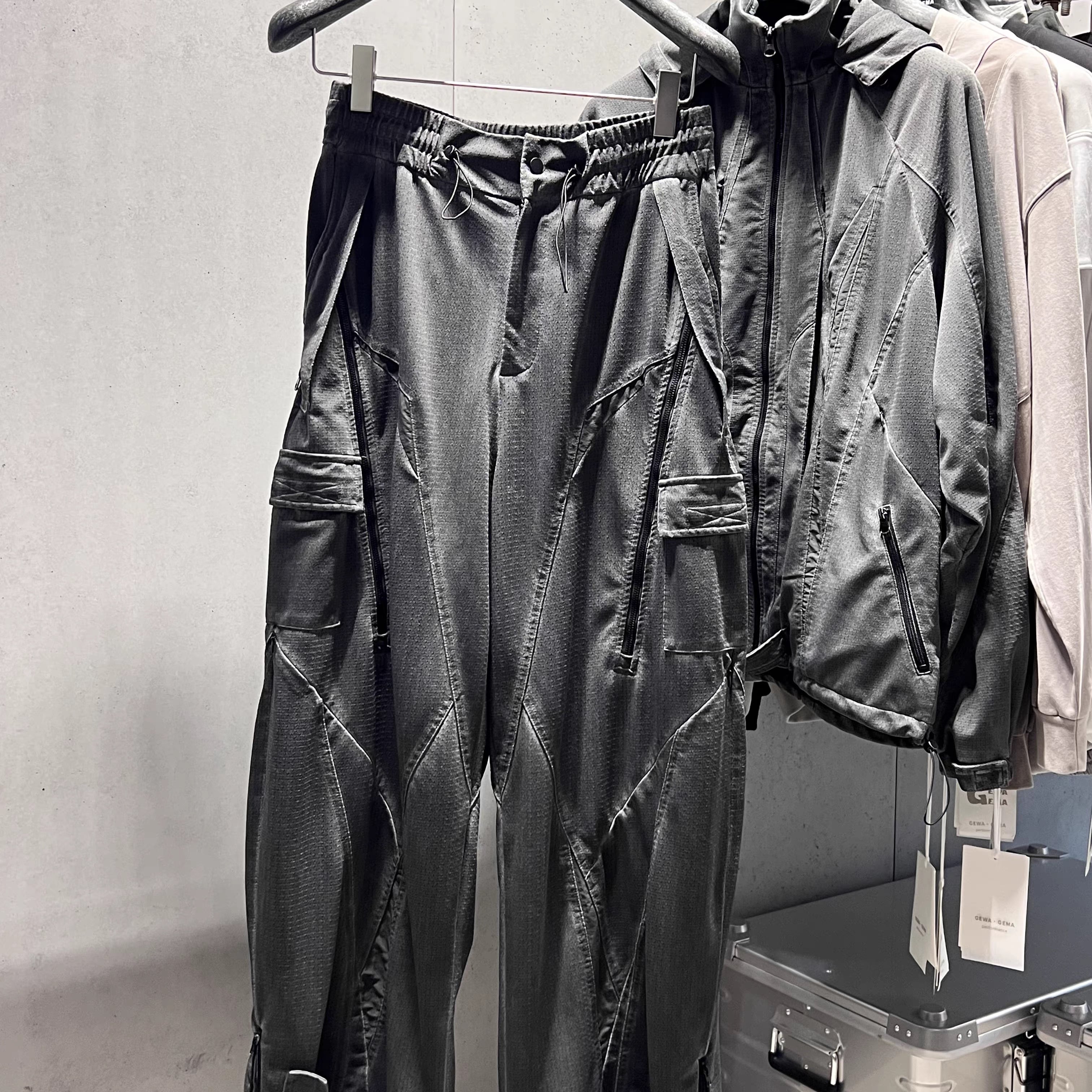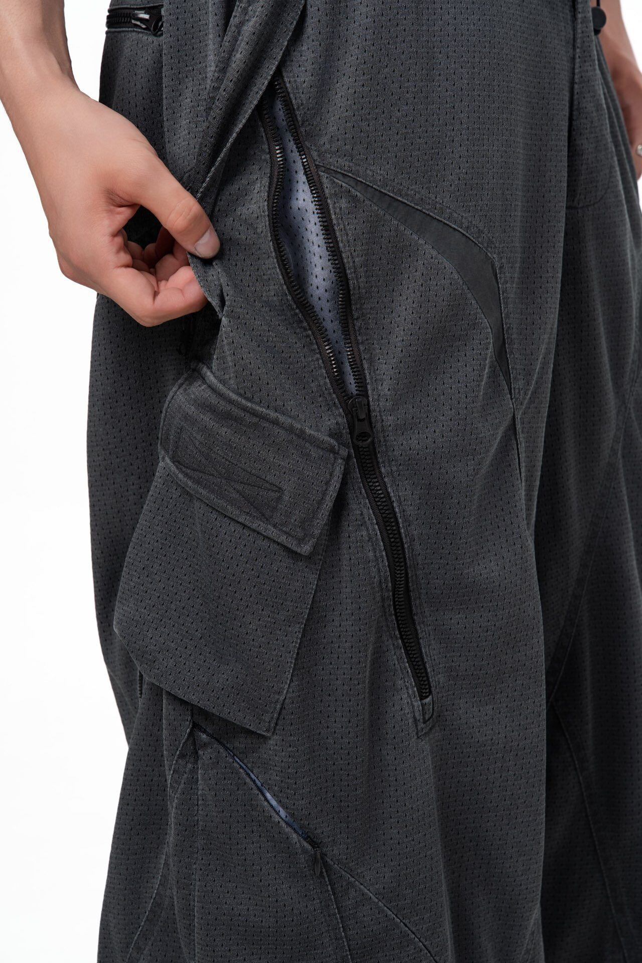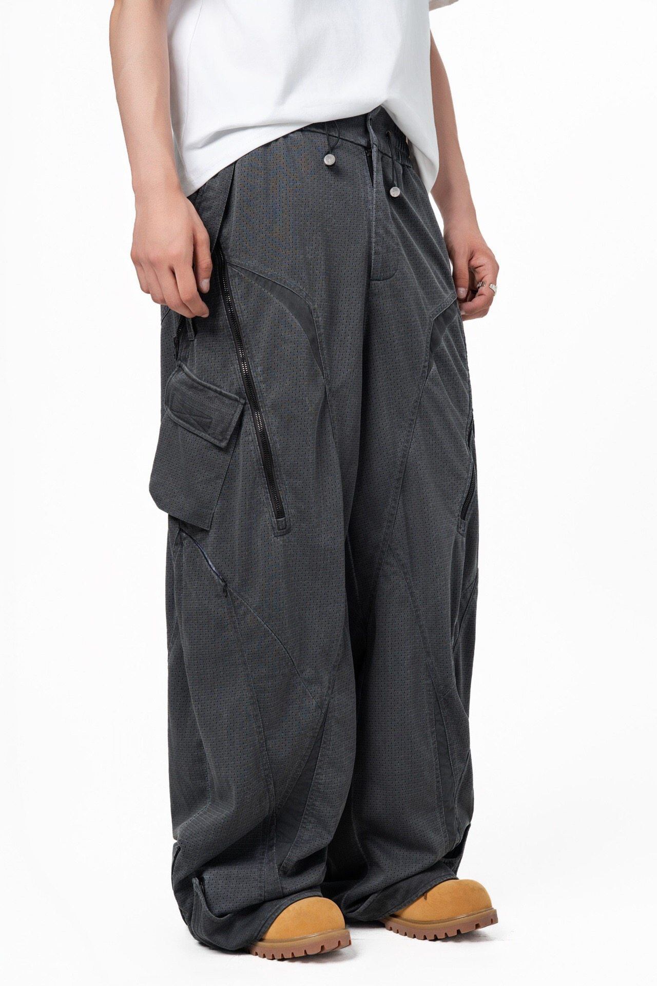 アウトドアと未来的デザインを融合したデコンストラクトパンツ。