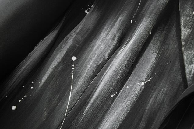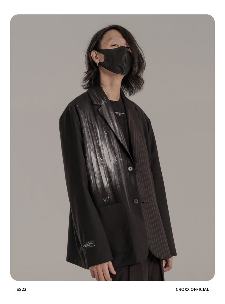 不規則なカットとパッチワークをデザインコンセプトとし、前身頃には手描きと墨流し技法を採用
