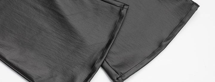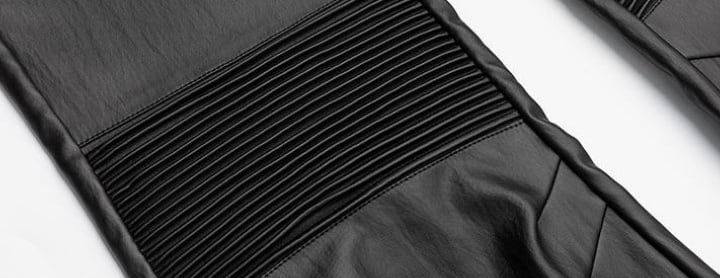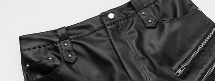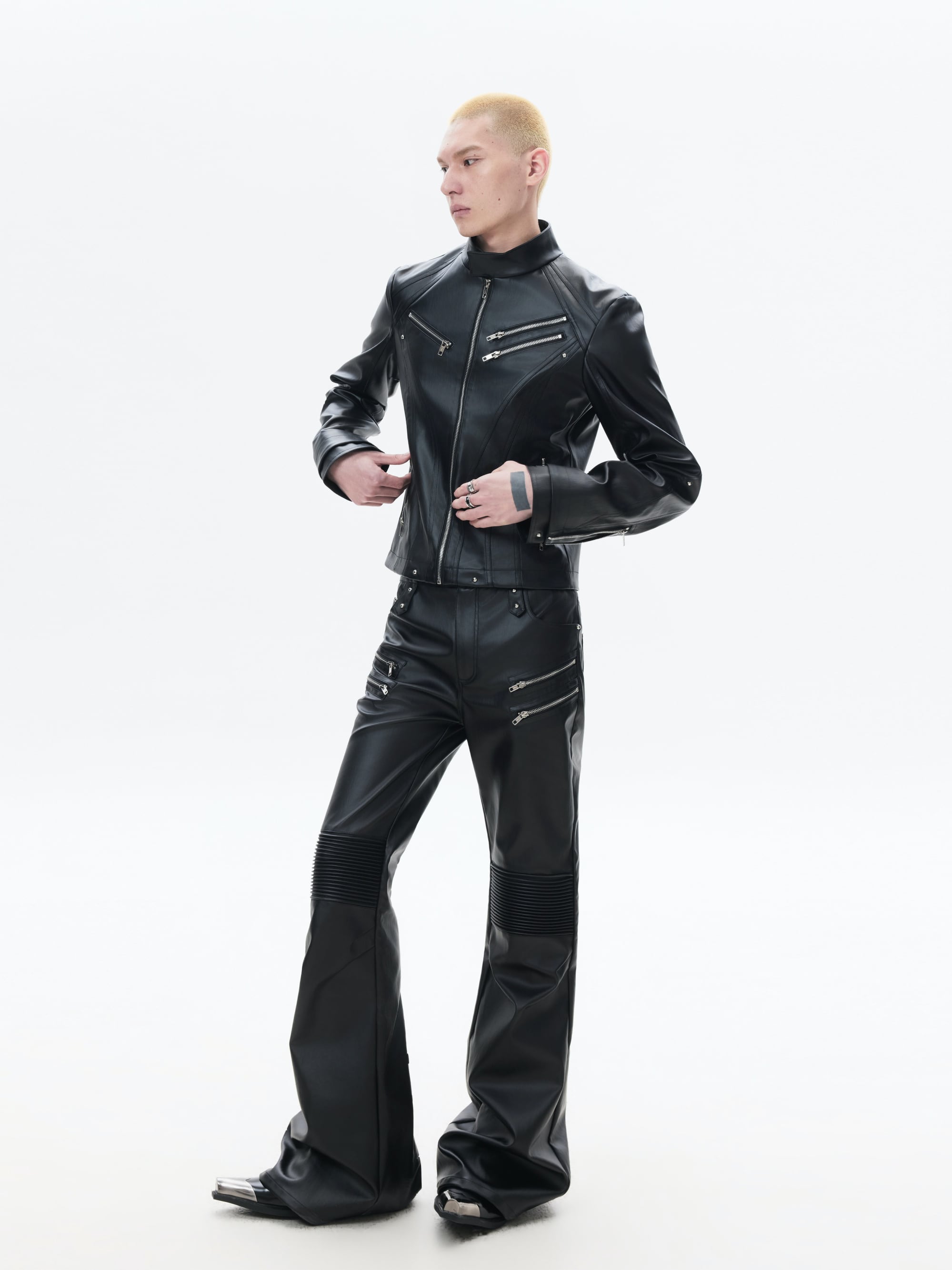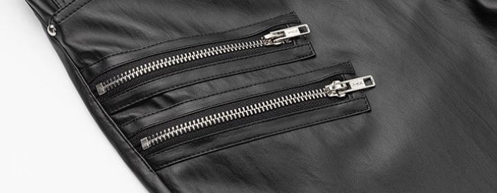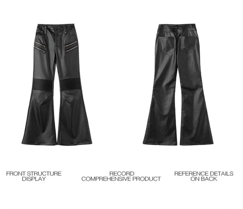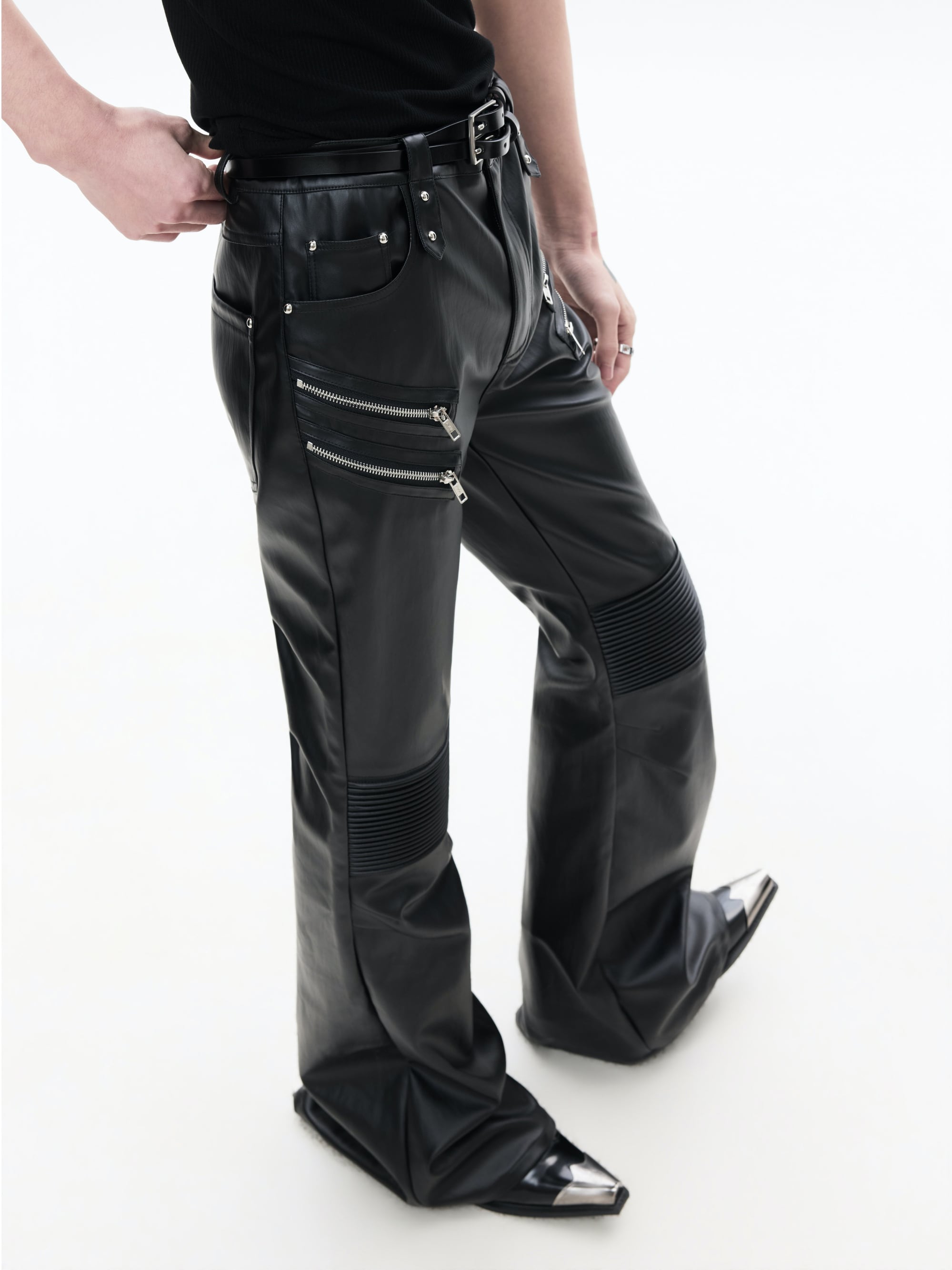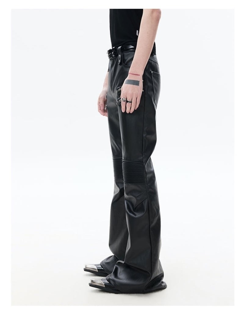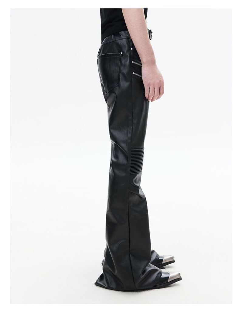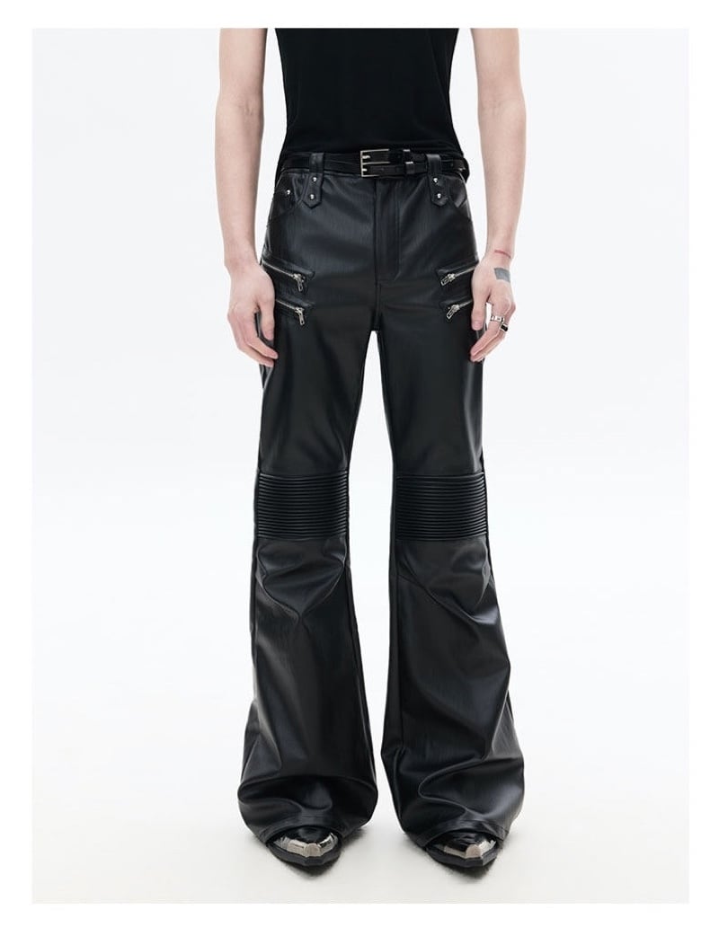 FRKM SCD 26SS パイオニアマルチジップブラックバイカーレザーパンツカジュアルパンツプリーツ膝サポートコーティングマイクロパンツ