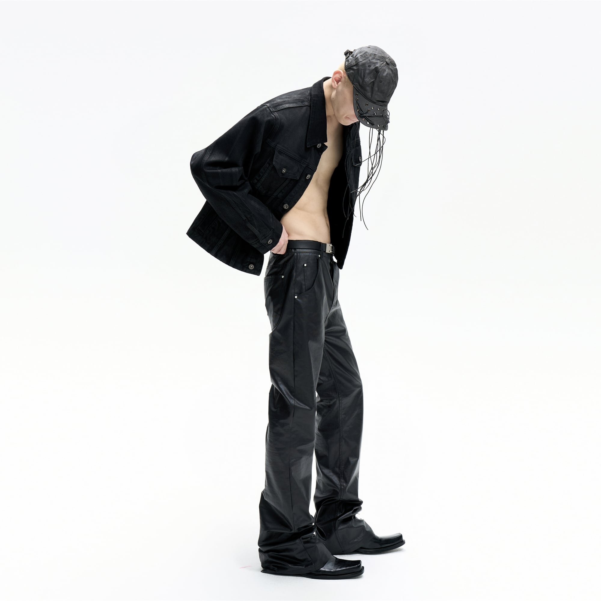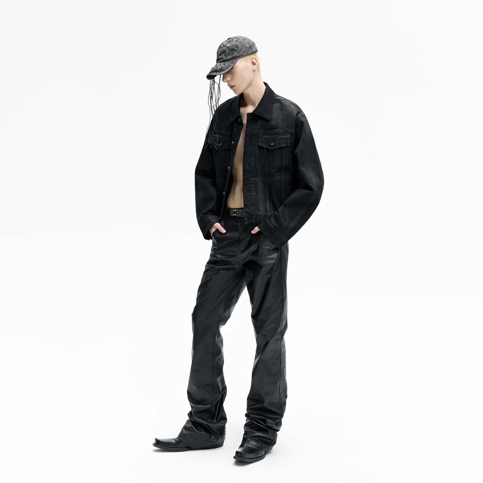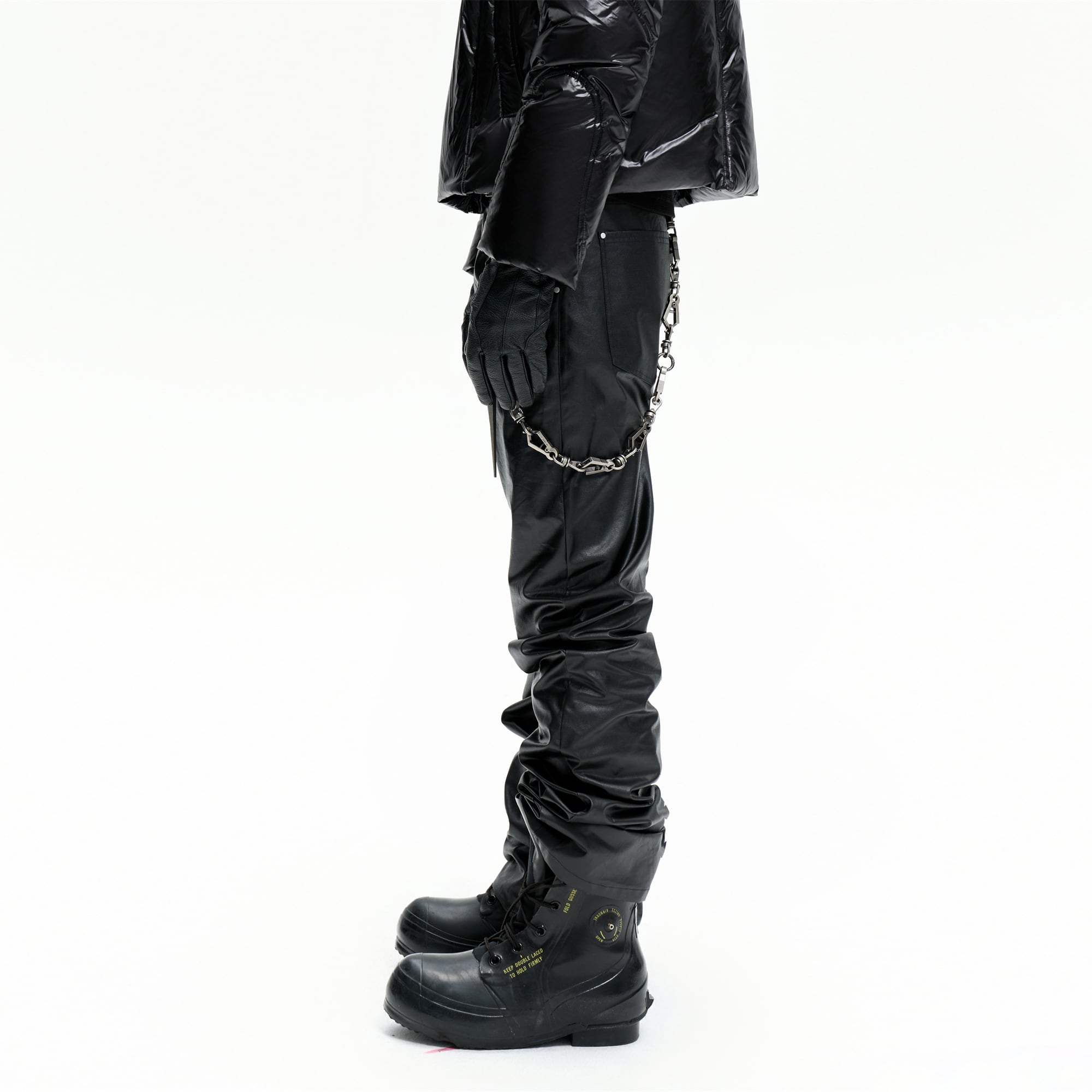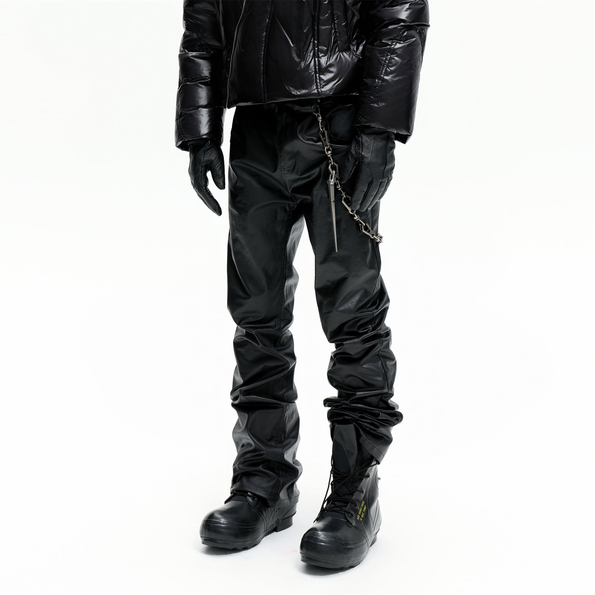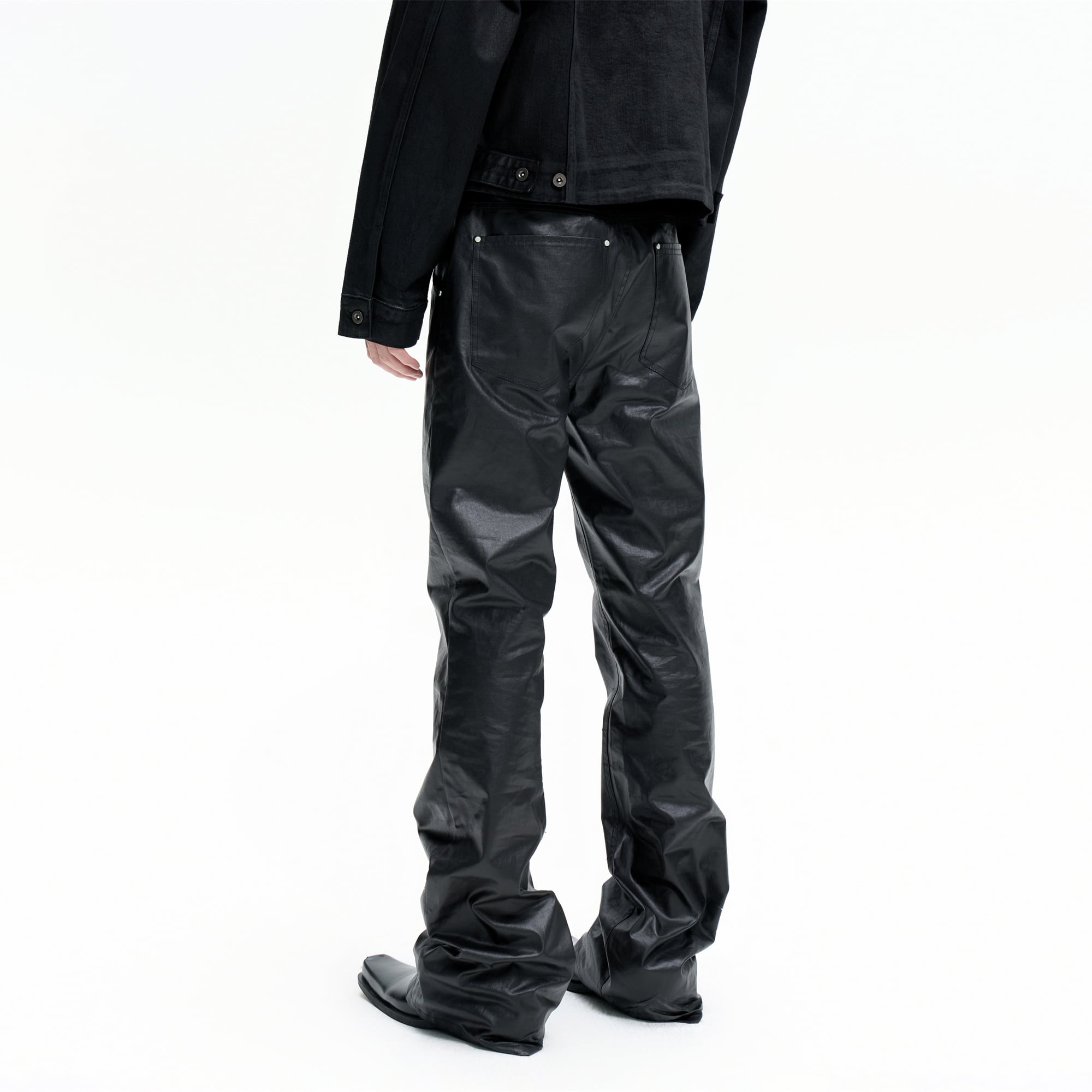 職人の手作業による刷り込みワックスコーティングを施した独特の質感が特徴です ミステリアスで深みのあるブラックを基調とし芸術性と実用的な機能美を高い次元で融合させています 裾にかけて溜まるスタックシルエットが足元に力強いボリュームを与え独自のスタイルを確立します 単なる衣服ではなく個性を勇敢に表現する人のためのアイデンティティを象徴する一着です