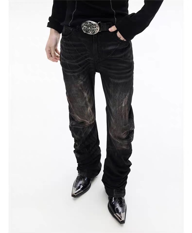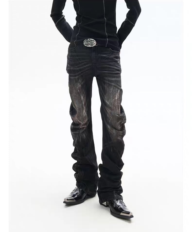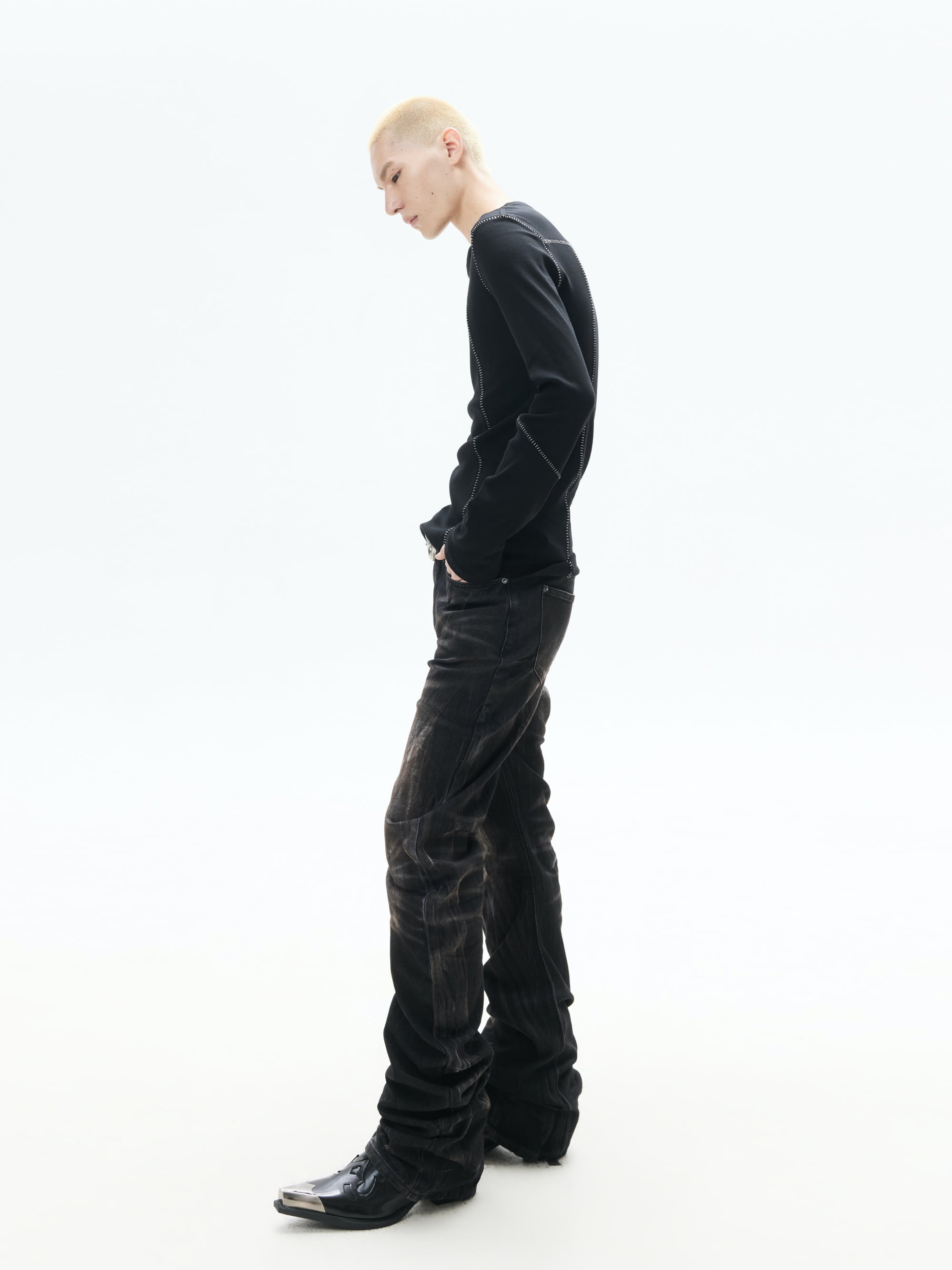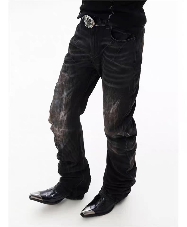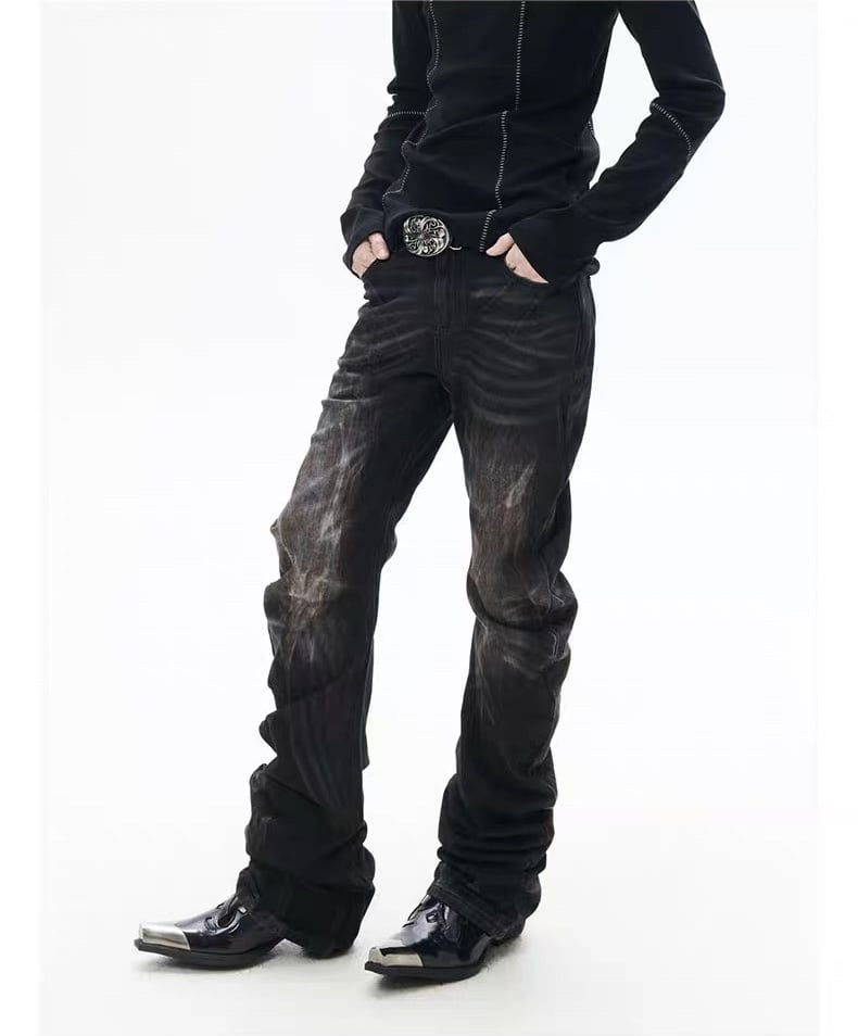錆びたような質感の特殊なウォッシュ加工を施すことで深みのあるヴィンテージ感を表現しました 身体のラインに沿うように設計された立体的なカーブドシルエットが美しいレトロな雰囲気を演出します 膝下に溜まりを作るスタックドデザインと立体的なヒゲ加工が特徴的な一本です 99パーセントのコットンにストレッチ素材を配合し肌馴染みの良さと動きやすさを両立させています
