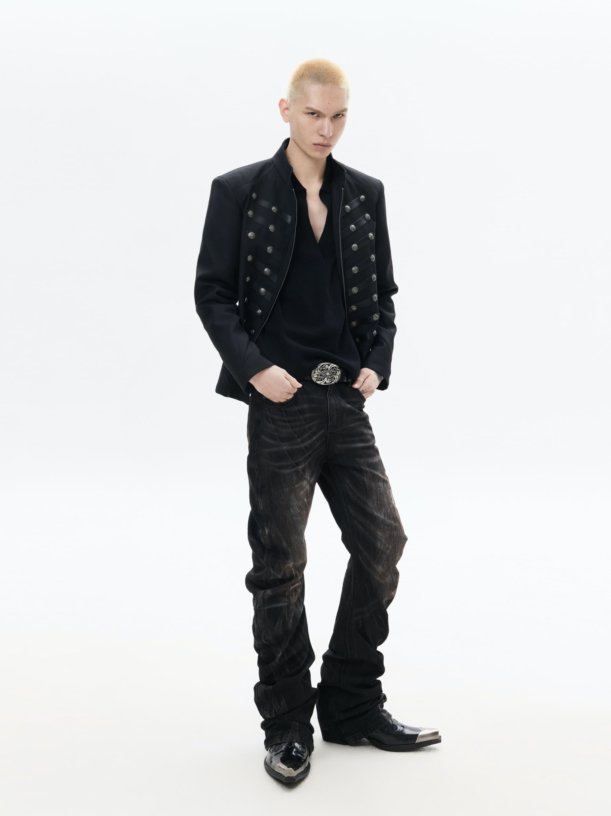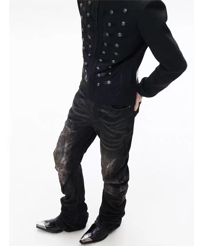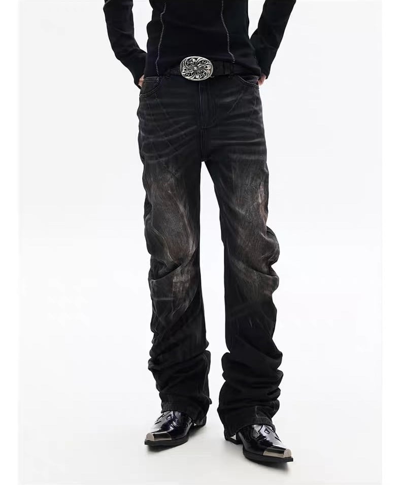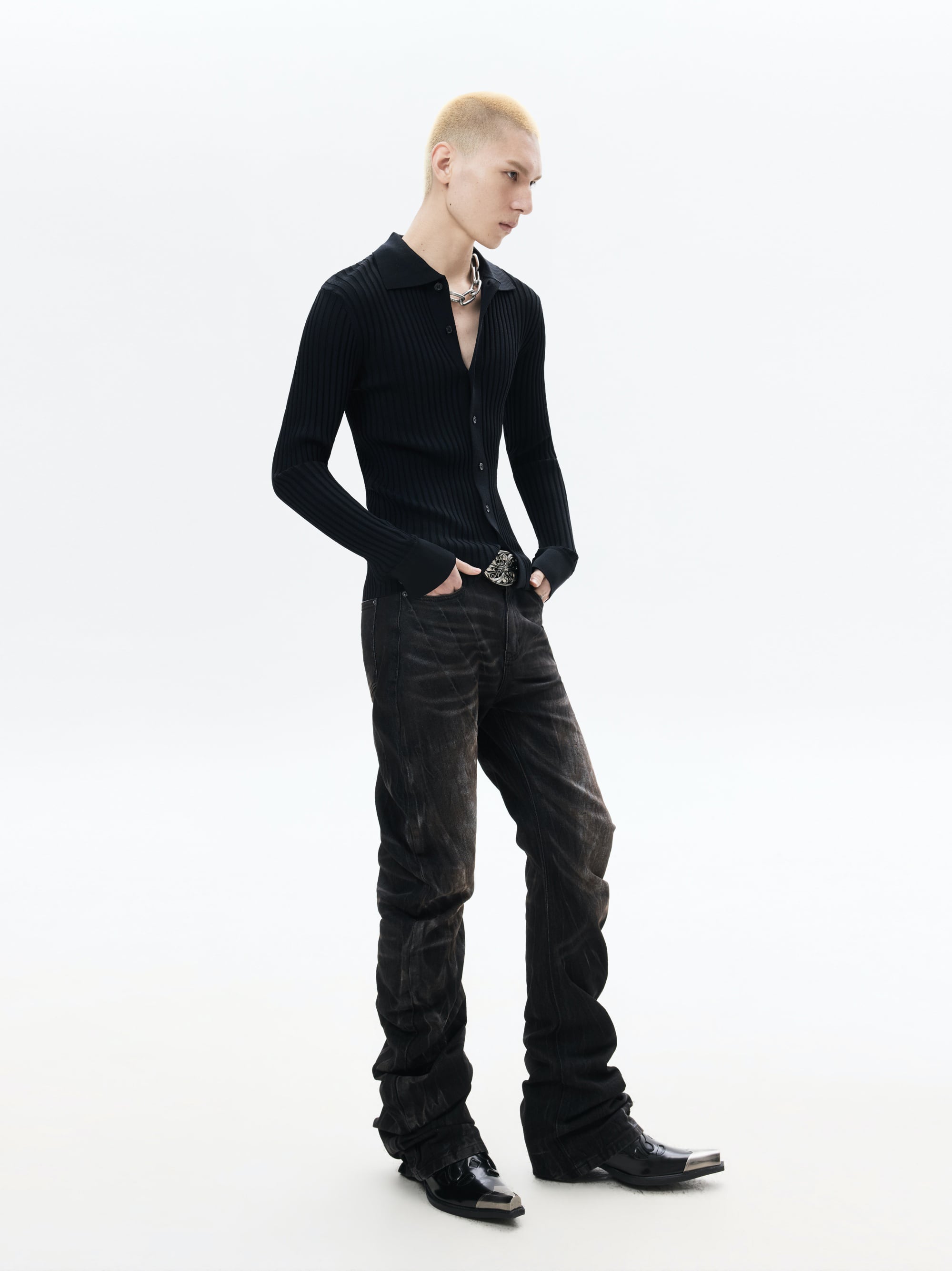 錆びたような質感の特殊なウォッシュ加工を施すことで深みのあるヴィンテージ感を表現しました 身体のラインに沿うように設計された立体的なカーブドシルエットが美しいレトロな雰囲気を演出します 膝下に溜まりを作るスタックドデザインと立体的なヒゲ加工が特徴的な一本です 99パーセントのコットンにストレッチ素材を配合し肌馴染みの良さと動きやすさを両立させています