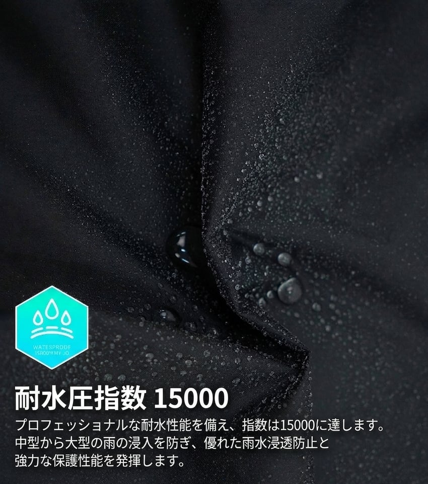 耐水圧15000mmを誇る優れた防水性と防風性を備え雨天時のアクティビティを強力にサポート