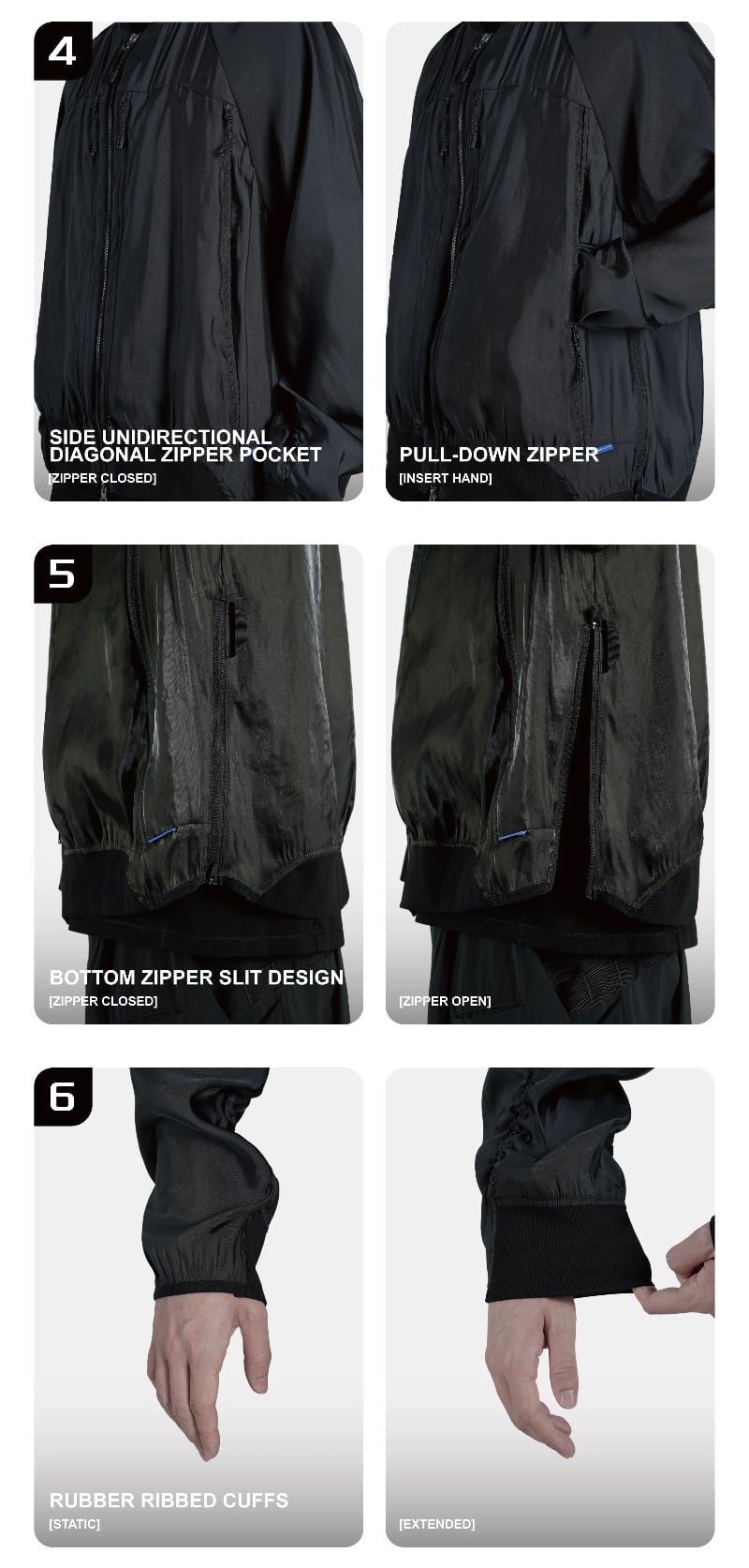 フロントには双向拉链を備えシルエットの調整や内部へのアクセスを自在に行えます