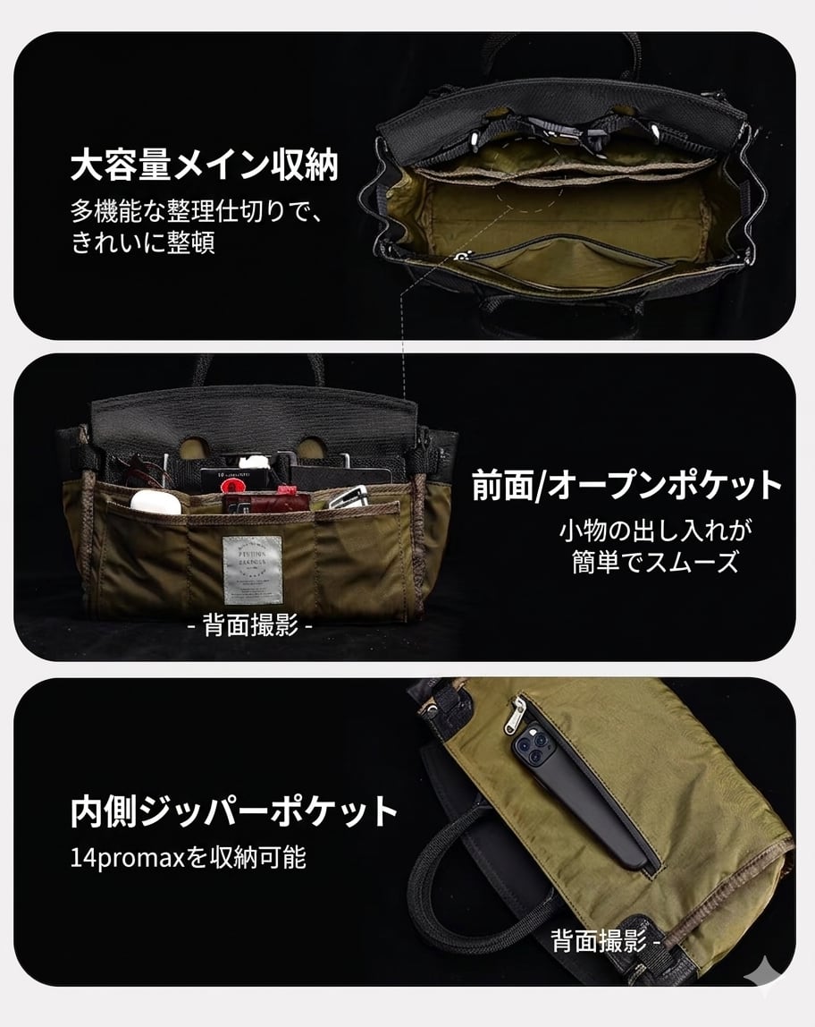 手提げ、ショルダー、斜め掛けの3WAYで活用でき、都市生活からアウトドアシーンまで幅広く対応するミニマルかつ重厚な仕上がりです