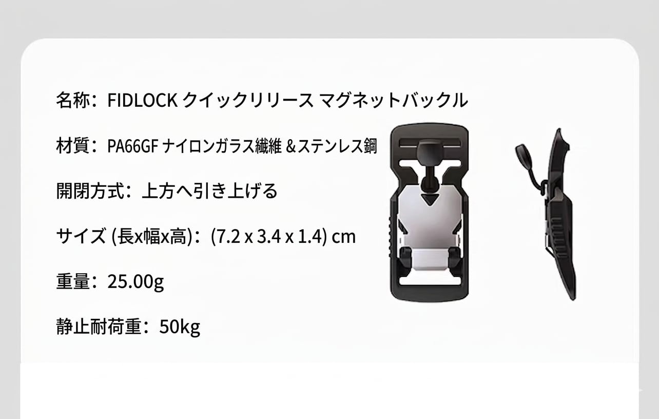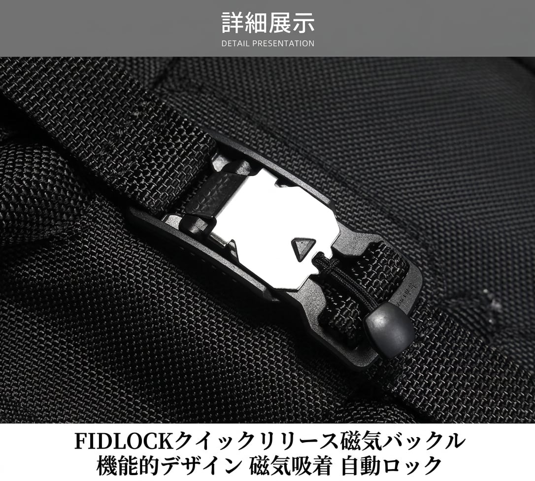 ドイツのFIDLOCK社製クイックリリース磁気バックルをフロントに配し、ワンタッチでの開閉とタクティカルな視覚効果を両立しています