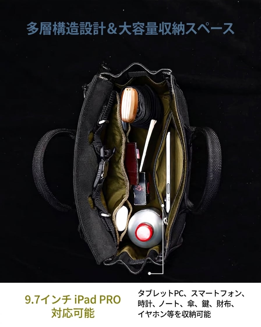 内部は多層構造のコンパートメント設計となっており、9.7インチまでのタブレットやスマートフォン、ノートなどを機能的に収納可能です