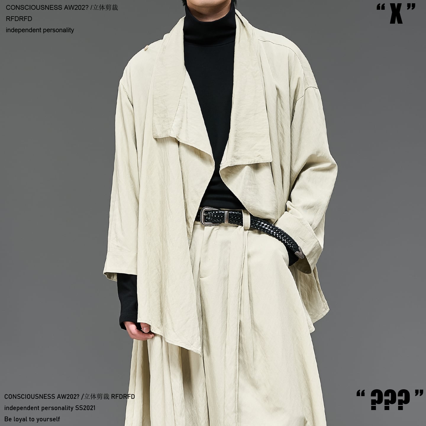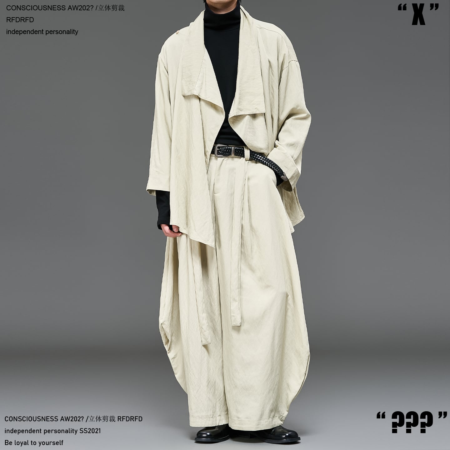 ジャケットは帯留めのようなベルト使いでシルエットの変化を楽しめる設計