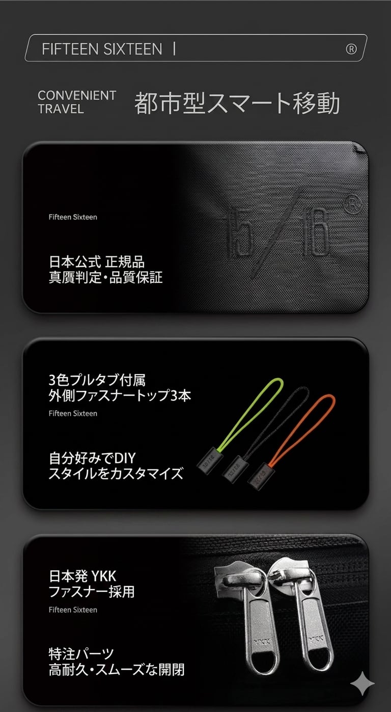 引き算の美学に基づいた漆黒の外観にDIY可能な3色のジッパータブが個性を添える