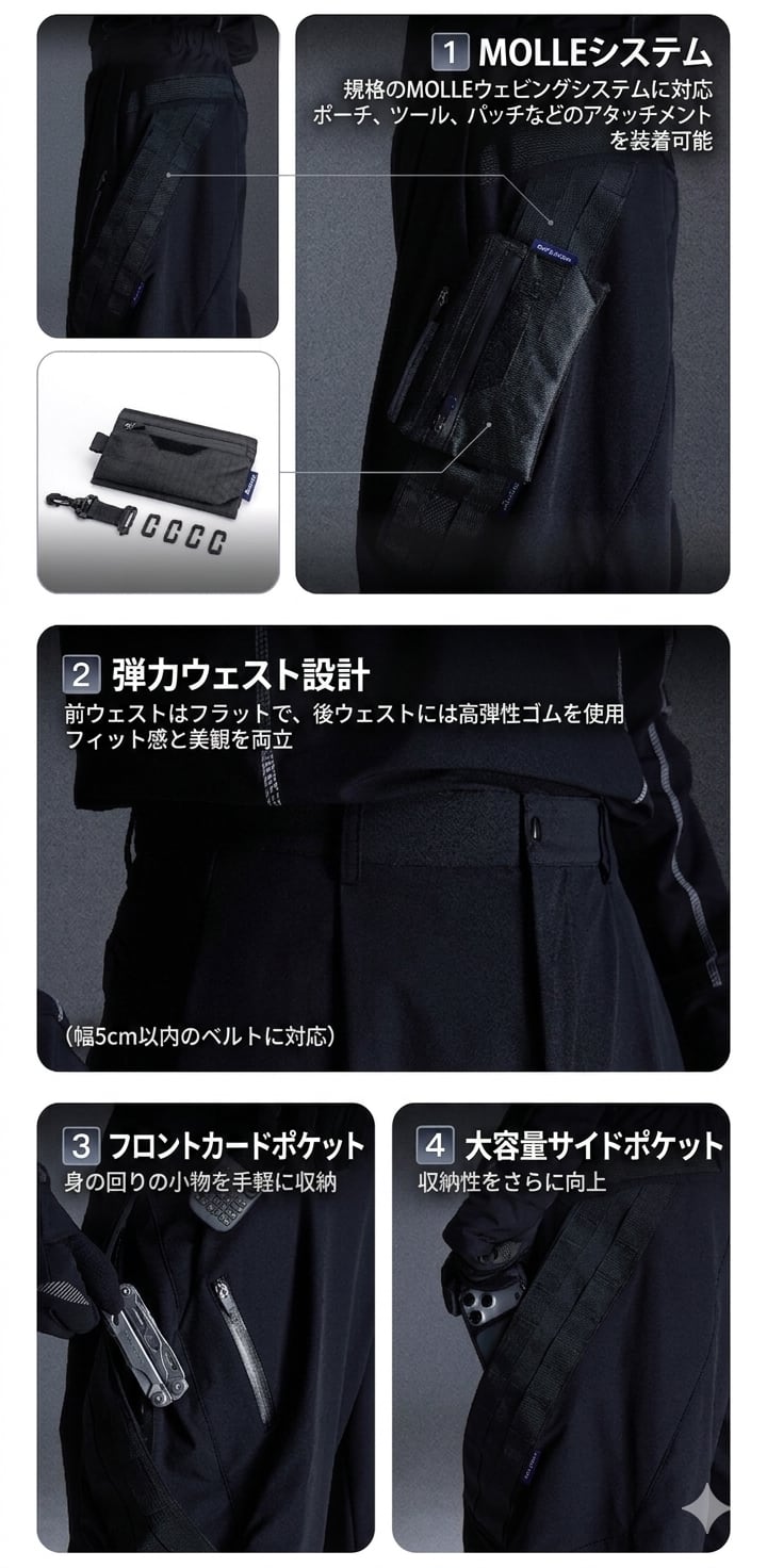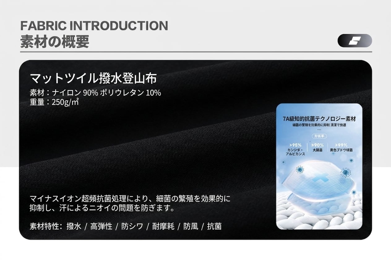 生地には撥水性と耐摩耗性に優れた高弾性マットツイルを採用しシワになりにくくタフな環境下でも快適さを保ちます